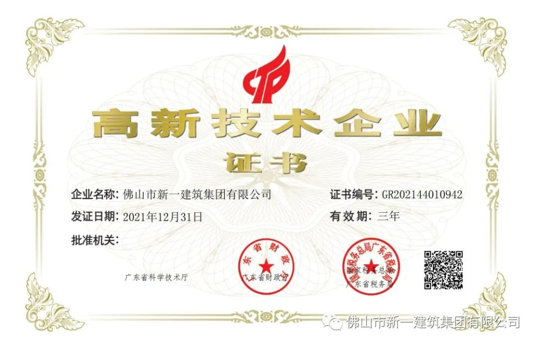 簡(jiǎn)訊|佛山市新一建筑集團(tuán)有限公司取得“高新技術(shù)企業(yè)”證書